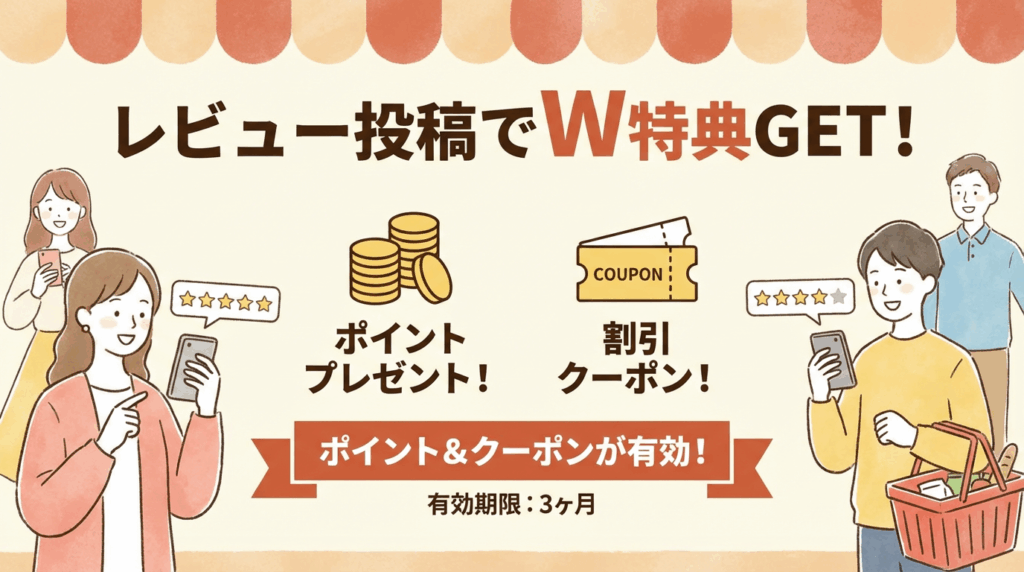 ポイント付与は次回のお買い物につながる可能性もあるが、Yahoo!ショッピング内すべての店舗、Yahoo!ショッピング外でも利用することができるため、リピーター施策としては次回使えるクーポンが効果的です。リピーター商材はクーポンの方がお客様にもメリットがあるし、ポイント付与額より高めの設定も可能なため、レビュー投稿もされやすくなると思います。