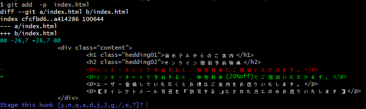 パッチオプション-pを使うと、指定したファイルのhunkが順に表示されて、ステージするか「y」「n」で選択していきます。上から順番なので、目当てのhunkが下にあるとその分手順は増えます。「y」「n」以外にもオプションが多くあり、使いこなせれば柔軟にステージする部分を選択できます。