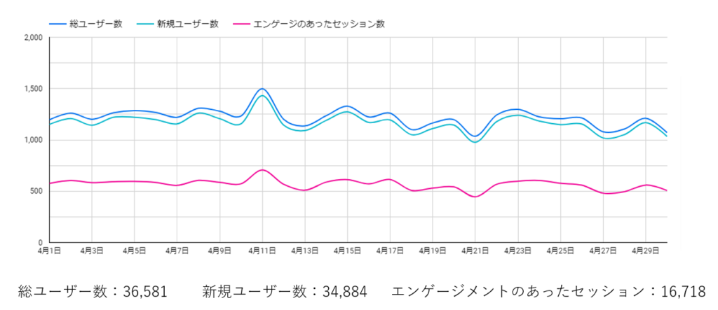 4月のデイリーのアクセス状況です。平均1220ユーザー/日が訪問しているようです。ここでは、デイリーで多い日と少ない日のトレンドがあるかということを把握しておきたいと思います。ECサイトであれば新商品の掲載やDM送信のタイミングが設定しやすくなります。上記グラフでは、ほぼ一定に推移しているためトレンドはつかみにくいですが、4月11日にアクセスが伸びている要因を確定することによって全体的なアクセスアップの施策がたてられるかもしれません。