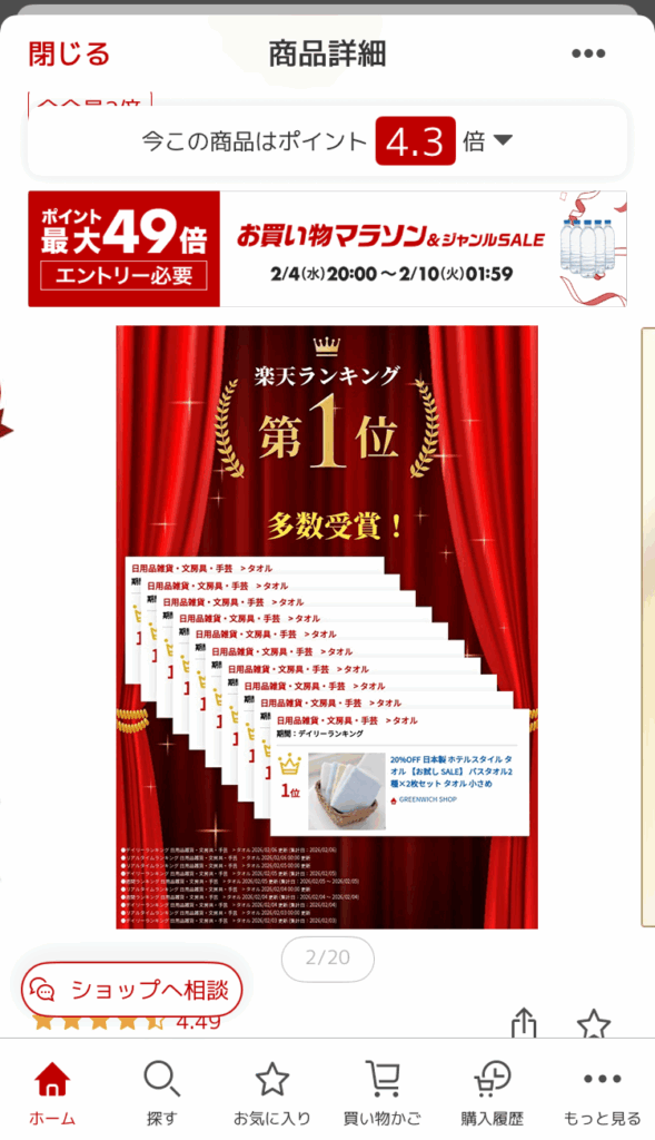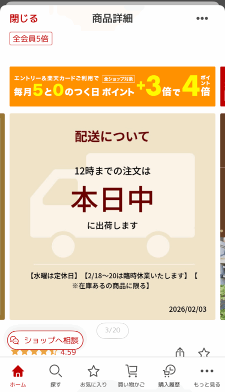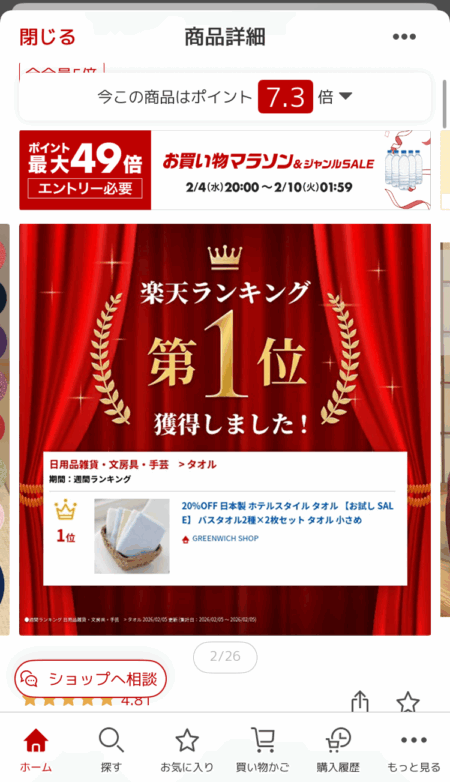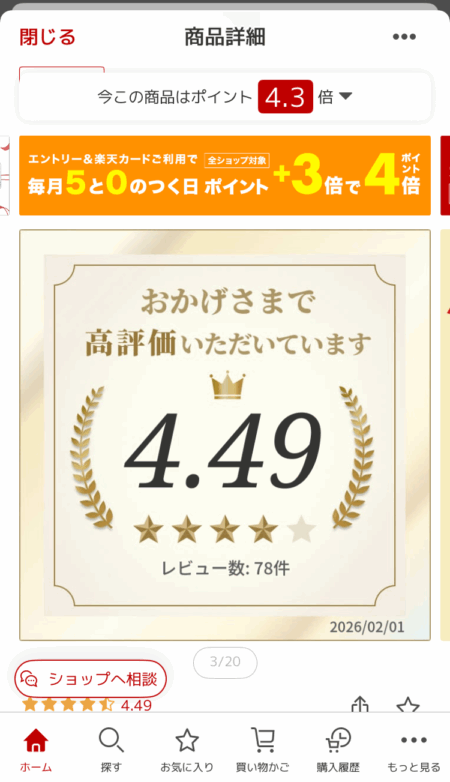 楽天市場のスマホの商品ページは、 商品画像 がファーストビューに表示され、ユーザーはそれらをフリックしながら閲覧する構成です。